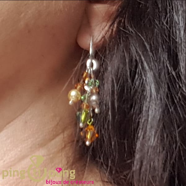 Deux boules en cristal l'une écrue, l'autre marron renforcent l'éclat de ces boucles.