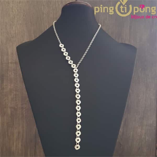 Très habilement, ce collier peut se porter devant en sautoir mais également dans le dos pour accompagner une robe dos-nu.